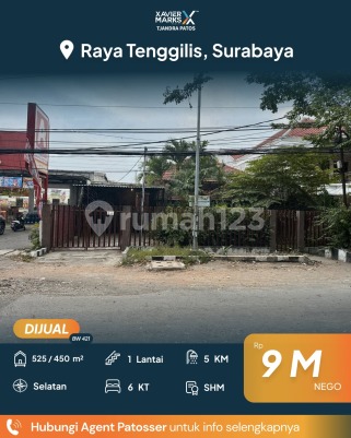 DIJUAL SUPER MURAH RUMAH NOL JALAN RAYA TENGGILIS AREA KOMERSIAL COCOK UNTUK SEGALA USAHA LT 525 m² (15x35) LB ± 450 m² Bangunan 1 Lantai KT 6 KM 5 Hadap Selatan SHM Garasi 2 mobil Carport 3 mobil Harga 9,5M NOW 9M Nego Hub: Brigitta Wong 0811309xxxx Xmarks Tjandra Patos Surabaya Selatan dekat Jalan Ahmad Yani, Jemursari, Tenggilis Mejoyo, Gayung Kebonsari, Pagesangan, Ketintang, Margorejo, Siwalankerto, Rumah Sakit Royal Surabaya, RS Bhayangkara, RS Islam Jemursari, RSAL Dr. Ramelan, RS Marina, Mall CITO City of Tomorrow, Royal Plaza, Maspion Square, Plaza Marina, DTC Wonokromo, UNESA Ketintang, Universitas Kristen Petra Siwalankerto, PENS, STIKOM Surabaya, Pasar Wonokromo, Pasar Karah, Pasar Gayungan, Pasar Margorejo Indah, Masjid Nasional Al-Akbar Surabaya, Terminal Joyoboyo, Bundaran WARU, Taman Pelangi, Darmo Park