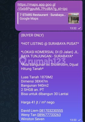 (BUYER ONLY) *HOT LISTING @ SURABAYA PUSAT* *LOKASI KOMERSIAL DI (0 Jalan) JL. RAYA TUNJUNGAN - SURABAYA* *Ada Bangunan ex Showroom, Dijual Hitung Tanah* Luas Tanah 1870M2 Dimensi 38X47m Bangunan 940m2 2 SHGB an. PT Bisa untuk dibangun 30 Lantai Harga 41 jt / m² nego David Liem 0817xxxxxxxx Weny Tan 0896xxxxxxxx Winston Seven
