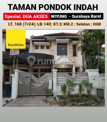 Dijual Rumah Spesial Ada 2 Jalan DEPAN + BELAKANG *Taman Pondok Indah* ( Wiyung - Surabaya Barat) Modern minimalis PLUS : *- SEMI Furnished* *- Full Rooftop Canopy DEPAN Rumah* *- BALKONY Depan dan Belakang* *- PAGAR* STRATEGIS Lokasi : *- dekat Raya Wiyung, perum Babatan Pratama, akses Tol Gunungsari* *- One Gate System - Keamanan 24 Jam* Spesifikasi L.Tanah : 168 m2 ( 7 x 24 ) L.B: +/- 140 m2 (7×20) Bangunan 2 Lantai K.Tidur : 3 K.Mandi : 2 Garasi /Carport : 2 mobil Row jalan Lebar 11 meter Listrik 3000 watt Hadap : Selatan Sertifikat : HGB *Jual 2,6 M (Nego)* Hubungi: *Sentosa Lie* Ray White North West Citraland Surabaya 0819-382-6xxx9 0813-571-xxx-09(whatsapp & Telegram) IG sentosa.raywhite ********