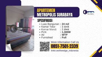 Sewa Apartemen Metropolis Surabaya Spesifikasi : Luas Bangunan 24 m2 1 kamar mandi 1 kamar tidur Apartemen Studio Harga Sewa 24 Juta / Tahun Detail info hub : Luluk The EdGe 8 Manfaat menggunakan Jasa The EdGe : 1. Terdaftar sbg Anggota Arebi no : 02.0214 dan NIB sehingga standar pelayanan profesional 2. 6 orang Tenaga Ahli Sertifikasi Kompeten dari LSP BPI dan LSP BPN 3. Spesialis gudang/industri di jatim sejak 2003( 850+ transaksi) 4. Berpengalaman handel perusahaan multinasional, PMA dan tbk 5. Berpengalaman buat konsep pergudangan yg mudah utk dijual 6. Melek Pajak untuk transaksi properti (pph,ppn dll) 7. Alamat kantor : Jl.Bubutan No.8 Surabaya 8. Cinderamata dari Pengembang Kawasan Industri terbesar di jawa timur PT. SIER/PIER