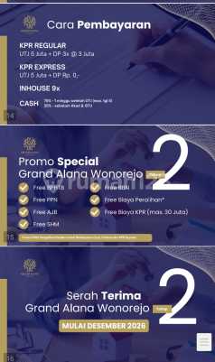 Dijual Rumah di Grand Alana Wonorejo 2, Lokasi Strategis dekat jalan raya Merr Surabaya Timur Lokasi Strategis * 1 menit rencana jalan OERR dan Wisata Mangrove * 5 Menit ke Jalan Merr dan Universitas Dinamika * 10 menit ke UPN dan Transmart * 15 menit ke Galaxy Mall dan Pintu Tol Tambak Sumur * 20 menit ke Bandara Juanda Ukuran Rumah ada Beberapa Pilihan : * 28/27m² * 31/27m² * 30/50m² * 48/50m² * 66/60m² * 63/84m² Promo Special : * Free BPHTB * Free PPN * Free AJB * Free SHM * Free BBN * Free Biaya Peralihan* * Free Biaya KPR (max 30 juta) *Promo FREE Pengalihan Berlaku untuk Pembaaran Cash, Inhouse dan KPR Express Cara Pembayaran Flexibel : * KPR Regular : UTJ 5 juta + DP 3x @3 juta * KPR Express : UTj 5 juta + DP 0 * INHOUSE 9x * CASH : * 75% 1 minggu setelah UTj (max tgl 5) * 25% sebelum Akad dan STU (Serah Terima Unit) HARGA START 400juta an Cicilan Ringan Start 2,3juta-an/bulan nya UTJ Hanya 3 Juta Saja Full Refundable (Tidak cocok dengan unit nya 100% Uang Kembali) Hubungi Daniel Lie Raywhite Royal Residence WA/Call 0812358xxxx