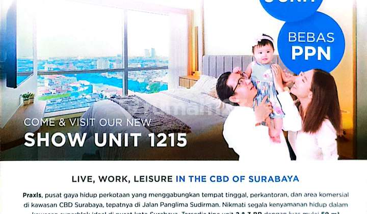 Praxis, Pusat gaya hidup perkotaan yg menggabungkan tempat tinggal, perkantoran, dan area komersial di kawasan CBD Surabaya, tepatnya di Jl. Panglima Sudirman. Nikmati segala kenyamanan hidup dlm kawasan Superblok ideal di pusat kota Surabaya. Tersedia type unit 2BR dengan luas mulai 59 M2. Lokasi strategis : * 3 menit ke RS Siloam * 3 menit ke BRI Tower, Bumi Mandiri * 5 menit ke mall Tunjungan Plaza, Grand City, Delta Plaza * 10 menit ke sekolah SMAK St Louis 1, Santa Maria, Unika Widya Mandala, Unair Hubungi : SESILIA WA : 0812314xxxx