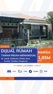 *Dibawah Appraisal Rumah Siap Huni Taman Indah Menanggal Surabaya* [614] ✅️Semi Furnish ✅️Appraisal Diatas 2M LT 195m² (15×13) LB 160m² KT 4 KM 2 SHM Listrik 1200 Hadap Utara PDAM Pompa air *Harga 1.85M* Klien only, no cobroke *Thedy - WinMax* 0851xxxxxxxx OPG Tag Rumah Surabaya Selatan : Rungkut Jemursari Jemur Andayani Kutisari Kendangsari Tenggilis Panjang Jiwo Mastrip Kemlaten Kebraon Grand Harvest Ketintang Karah Jambangan Menanggal Gayungsari Gayungan