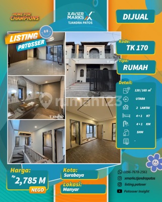 American Modern, high spec Manyar Luas Tanah : 6x20 (120 m²) Luas Bangunan : ±165m² Kamar Tidur : 4+1 Kamar Mandi : 4+1 PLN 2200w Hadap Utara SHM PBG lengkap Spek: - Sanitair TOTO all in (termasuk accesories standart bathroom) - Light downlight, spotlight standart interior - Granit tile 80x80 (wisma sehati) - Carport 2 Mobil - Row jalan 7m - Instalasi AC dan Air Panas sudah tersedia tiap ruang - taman tengah - Skylight area tangga - Free Tandon atas, bawah - Free 2 Pompa Harga 2,785M nego Detail, konten & survey Tristi 0817503xxxx XMarks Patos Pakuwon City Mall Surabaya Timur dekat Jalan Raya MERR, Rungkut, Kenjeran, Arif Rahman Hakim, Kertajaya, Dharmahusada, Kalijudan, Manyar, Rumah Sakit Premier, RS Haji, RS Unair, RS Mitra Keluarga, RS Gotong Royong, Galaxy Mall, Pakuwon City Mall, Transmart Rungkut, Kampus ITS, UNAIR, Sekolah Kristen Petra, Sekolah Gloria Galaxy, Pasar Keputran Timur, Jembatan Kenjeran, Taman Surabaya, Harmoni Keputih