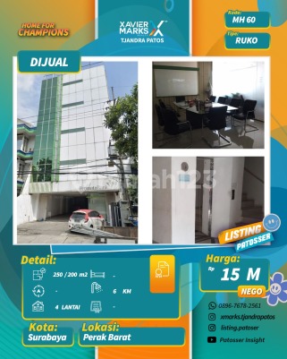 DI JUAL/DI SEWAKAN RUKO - PERAK BARAT Spesifikasi : * LT : 250 m2 * LB : 200 M2 * 4 Lantai * Listrik : 13.200 * 2 kamar mandi tiap lantai * 1 lantai untuk parkir * Ada Fasilitas lift * Ada tangga utk akses setiap lantai * IMB lengkap * Ex. Bank Permata * Sertifikat : Surat Ijo Harga : * Jual : 15 M * Sewa : 4 lantai 400 JT/tahun (owner berkantor di lantai 5) Hubungi : Makrus Hasan (Aan) Hp : 0857xxxxxxxx Xavier Marks Tjandra Patos Surabaya Utara dekat Jalan Rajawali, Kembang Jepun, Perak, Kalimas, Nyamplungan, Dupak, Pegirian, Rumah Sakit PHC, RS Al Irsyad, RS Pelabuhan, RSUD Soewandhie, Pasar Atom, ITC Mega Grosir, Pusat Grosir Dupak, Kampus Universitas Hang Tuah, MAN 1 Surabaya, SMKN 2 Surabaya, Masjid Sunan Ampel, Jembatan Merah, Pelabuhan Tanjung Perak, House of Sampoerna, Kya-Kya, Tugu Pahlawan, Jembatan Suramadu, Kenjeran Lama, Sentra Ikan Bulak, Wisata Mangrove, Taman Prestasi, Kalimas Riverfront.