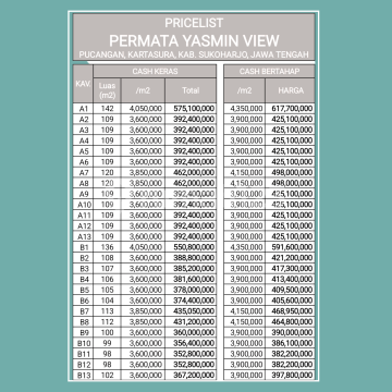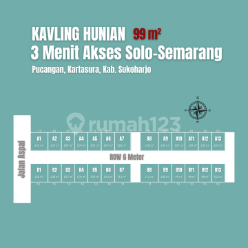 Kavling Pucangan, Kartasura. Cocok Hunian Kawasan Berkembang Barat Kota Solo. Spesifikasi : - Tersedia 26 Unit Kavling - Luas : 98 s.d 146 m2 - Lebar Depan : 9 m - SHM Pekarangan - Row Jalan 5 Meter - Mobil Simpangan - Siap Akad Notaris Info Sekitar Lokasi: - 200 Mtr Jl. Brigjen Katamso - 2 Menit SD Islam Terpadu Taqiyya Rosyida - 2 Menit Lapangan Ngemplak Kartasura - 3 Menit UIN Solo - 3 Menit Group 2 KOPASSUS - 4 Menit Keraton Kartosuro - 4 Menit PonPes Muhammad Al-Fatih - 6 Menit Tugu Kartasura