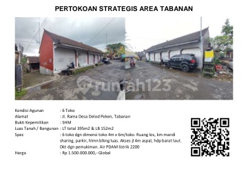 6 Unit Toko Siap Untuk Usaha Lokasi Strategis Di Jl. Rama Delodpeken, Tabanan Bali Spesifikasi : Luas Tanah : 395m² Luas Bangunan : 154m² Dimensi Toko : 4 x 6 ( 6 Unit Berjejer) Kamar Mandi : 2 PLN : 2200 Watt Air : PDAM Hadap : Barat Laut Akses Jalan Aspal Lebar 4 Meter Parkir Luas Ada Halaman Belakang SHM Harga 1,5M Nego
