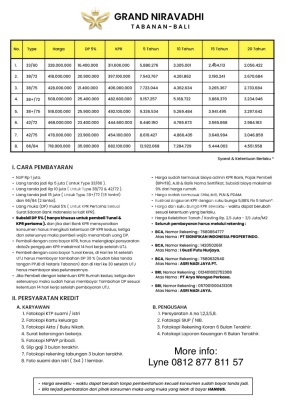 Di jual perumahan grand niravadhi luas area 8.5 hektar lokasi dekat : - pusat kota tabanan - sekolah - pusat belanja - rumah sakit - destination wisata - pantai tanah lot type rumah : 1. LT 60 LB 33 2. LT 72 LB 38 3. LT 75 LB 38 4. LT 72 LB 38 + 5. LT 75 LB 38 + 6. LT 72 LB 42 7. LT 75 LB 42 8. LT 84 LB 66 harga mulai dari 328 juta more info : LYNE 0812xxxxxxxx