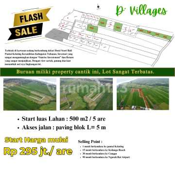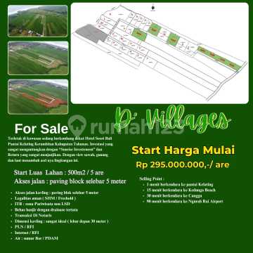 Kavling villa ekslusif. Terletak di kawasan sedang berkembang dekat Hotel Soori Bali Pantai Kelating Kerambitan Kabupaten Tabanan. Investasi yang sangat menguntungkan dengan "Sunrise Investement" dan Return yang sangat menjanjikan. Dengan view sawah, gunung dan laut menambah asri nya lingkungan ini. Luas tanah start dari : 500 m2 / 5 are ( sesuai plot terlampir ) Harga start dari : Rp 320 jt/ are / 100 m2 Akses jalan kavling : paving blok selebar 5 meter Legalitas aman ( SHM / Freehold ) ITR : zona Pariwisata non LSD Bebas banjir dengan drainase tertata Transaksi Di Notaris Dimensi kavling : sangat ideal / terlampir PLN / RFI Internet / RFI Air : sumur Bor / PDAM Selling Point : 1 menit berkendara ke pantai Kelating 15 menit berkendara ke Kedungu Beach 30 menit berkendara ke Canggu 90 menit berkendara ke Ngurah Rai Airport Buruan miliki property cantik ini Lot Sangat Terbatas