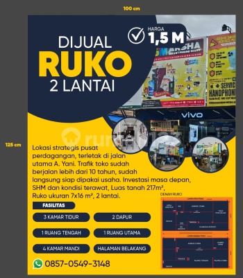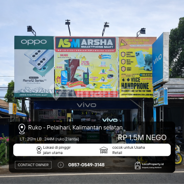 DIJUAL RUKO 2 LANTAI STRATEGIS - PUSAT PERDAGANGAN PELAIHARI Lokasi: Jl. Utama A. Yani, Kec. Jorong Kota Pelaihari, Kab. Tanah Laut Kalimantan Selatan Spesifikasi Properti: Luas Tanah: 217 m² Luas Bangunan: ± 224 m² (Dimensi 7 x 16 meter per lantai) Jumlah Lantai: 2 Lantai Legalitas: SHM (Sertifikat Hak Milik) Kondisi: Bangunan terawat & langsung siap pakai untuk usaha. Fasilitas Internal: Kamar Tidur: 3 Kamar Mandi: 4 Dapur: 2 Ruangan: 1 Ruang Utama & 1 Ruang Tengah Ekstra: Halaman belakang & Area jemuran (sesuai denah) Keunggulan & Selling Point: Prime Location: Terletak tepat di pinggir jalan raya utama A. Yani, jalur tersibuk di kawasan ini. Trafik Teruji: Lokasi usaha sudah berjalan lebih dari 10 tahun, sangat stabil untuk investasi masa depan. Lebar Maksimal: Dengan lebar ruko 7 meter, area display toko sangat luas dan mencolok dari jalan raya. Multifungsi: Desain fungsional, bisa untuk toko retail, kantor, gudang, atau tempat tinggal sekaligus. Harga: Rp 15000000xxxx M) Info & Survey: 0857xxxxxxxx Kode Listing: PLH-2W7