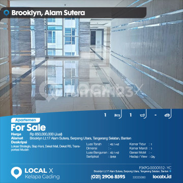 Lokasi Strategis, Siap Huni, Dekat Mall, Dekat RS, Transportasi Mudah For Sale - Jual Apartemen Brooklyn Lt.17 Alam Sutera, Serpong Utara, Tangerang Selatan, Banten Harga. Rp 85000xxxxJual) Deskripsi Properti. Lokasi Strategis, Siap Huni, Dekat Mall, Dekat RS, Transportasi Mudah Luas Tanah. 45.10 m2 Dimensi. - Luas Bangunan. 45.10 m2 Sertipikat. SHM Kamar Tidur. 1 Kamar Mandi. 1 Garasi Mobil. - Hadap / View. City LOCAL X Kelapa Gading ******** ⓪②① ②⑨⓪⑥ ⑧⑤⑨⑤ P3KPG-0000xxxx-YC-J