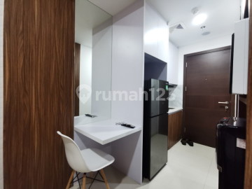 Pacific Garden Lantai 17 samping Binus Fully Furnished: AC (1½ PK), microwave, kitchen set, stove, cooker hood, refrigerator, water dispenser, water heater, Smart LED TV, working/study desk, dining table, bed (lapis latex), bed cover, wardrobe. Harga sewa 4 jt per bulan exc ipl air listrik Min sewa 6 bulan