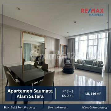 BEST DEAL !! DIJUAL/DISEWA MURAH !! APARTEMEN SAUMATA Alam Sutera LB : 146 M² Lantai Rendah Full Furnished (mesin cuci + pengering) KT : 3 + 1 KM : 2 + 1 Free IPL Sertifikat Dapur Kotor + Dapur Bersih Hadap Barat Laut View Swimming Pool Lokasi Sangat Strategis Direct Owner (SL) Harga Jual : 4.5 Miliar Harga Sewa : 325 Juta/Tahun