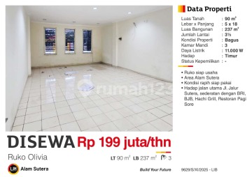 Ruko di Alam Sutera. Cek segera ruko yang modern ini, disewakan menghadirkan lingkungan fasilitas yang lengkap, cocok untuk Anda yang menginginkan hunian nyaman. Spesifikasi Utama Properti: - Kamar Mandi: 3 - Sertifikat: Lainnya(PPJB, Girik, Adat,dll) - Kondisi Perabotan: Unfurnished Fitur unggulan: - Siap Huni. - Bebas Banjir. - Lokasi di Pusat Kota. - Cocok Untuk Investasi. - Properti Bisa Nego. Berlokasi di Alam Sutera, ruko ini memberikan kemudahan akses ke berbagai fasilitas menarik. Dengan harga Rp. 16.583.333, anda bisa memiliki hunian premium yang sudah siap huni dan bersertifikat Lainnya(PPJB, Girik, Adat,dll). Ambil kesempatan untuk menikmati investasi di kawasan Alam Sutera yang nyaman ini! Hubungi segera untuk informasi lebih lanjut!