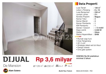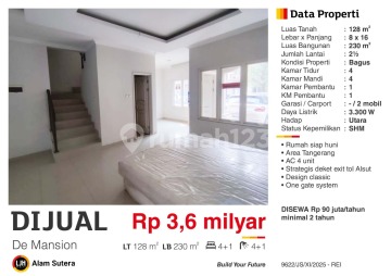 Kesempatan terbatas buat Anda dapatkan rumah strategis dengan return investasi tinggi di Alam Sutera, Tangerang. Rumah ini menawarkan lokasi yang strategis serta memiliki jumlah lantai 3 yang siap untuk segera Anda miliki, utamanya bagi Anda yang mencari hunian di lokasi yang dekat dengan fasilitas umum. Kondisi properti ini bagus dan memiliki desain modern yang menambah daya tarik dan estetika properti ini. Rumah ini berada di wilayah strategis. Detail Properti ini adalah: - Kamar Tidur: 5 - Kamar Mandi: 5 - Sertifikat: SHM - Sertifikat Hak Milik - Kondisi Perabotan: Semi Furnished Tidak hanya itu, namun properti ini juga memiliki keunggulan sebagai berikut: - Siap Huni. - Bebas Banjir. - Lingkungan Tenang dan Damai. - Cocok Untuk Investasi. - Cocok Untuk Dijual Kembali. - Properti Bisa Nego. - Lokasi Strategis. - Lokasi Bebas Banjir. - One Gate System. - Dijual Cepat Butuh Uang. Lokasi Strategis terletak di Alam Sutera, properti ini memudahkan akses Anda ke fasilitas-fasilitas utama dan unggulan. Harga yang sangat kompetitif yaitu, Rp. 3.600.000.xxx, rumah ini siap menjadi milik Anda! Nikmati segala kemudahan dan berbagai keunggulan menarik saat properti premium ini milik Anda.