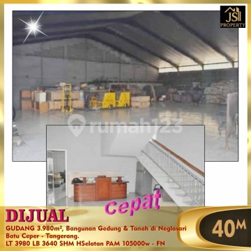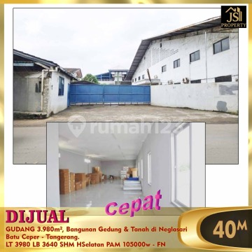 DIJUAL GUDANG 3.980m², Bangunan Gedung & Tanah di Neglasari Batu Ceper - Tangerang. Luas Tanah 3.980 m² Luas Bangunan 3.640 M² Ukuran Dimensi Bangunan 65 x 56 m² Bangunan berupa : Pabrik/gudang, Mess Karyawan & Kantor. Listrik 105.000 Watt ( Gardu sendiri ) Air PAM Hadap Selatan Sertifikat Hak Milik Lokasi sangat Strategis, dipinggir Jalan Raya Neglasari, Ada Pos Jaga , Sudah ada Genset, Bebas Banjir,Bangunan masih terawat dan Bagus, Siap Pakai. Harga 40 M Nego (No COBroke)