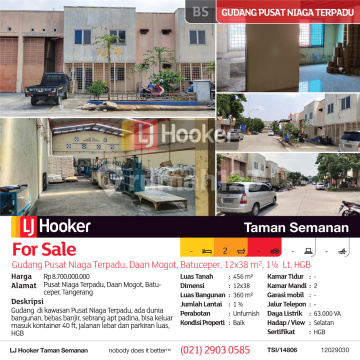 TSI/14806 For Sale Gudang Pusat Niaga Terpadu, Daan Mogot, Batuceper, 12x38 m², 1½ Lt, HGB Harga Rp 8.700.000.xxx Alamat Pusat Niaga Terpadu, Daan Mogot, Batuceper, Tangerang Deskripsi Properti Gudang di kawasan Pusat Niaga Terpadu, ada dunia bangunan, bebas banjir, sebrang apt padina, bisa keluar masuk kontainer 40 ft, jalanan lebar dan parkiran luas, HGB Luas Tanah 456 m² Dimensi 12x38 Luas Bangunan 360 m² Jumlah Lantai 1 ½ Perabotan Unfurnish Kondisi Baik Kamar Tidur - Kamar Mandi 2 Garasi mobil - Jalur Telepon - Daya Listrik 63.000 VA Hadap / View Selatan Sertifikat HGB LJ Hooker Taman Semanan Property Help ✆ 0212903xxxx
