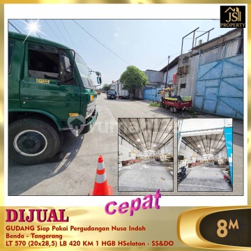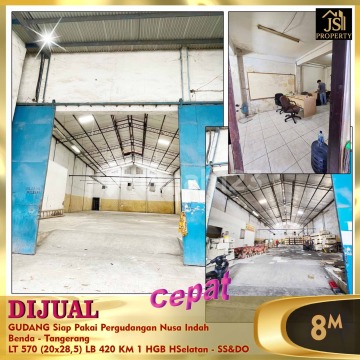 DIJUAL CEPAT GUDANG Siap Pakai Pergudangan Nusa Indah Benda - Tangerang Lokasi Strategis Dekat Bandara Soetta Masuk kontainer 40 feet Luas Tanah 570 m² Dimensi 20x28,5 m² Luas Bangunan 420 m² Kamar Mandi 1 Listrik 2.200 Watt Air Tanah Sertifikat 2 SHGB (berlaku sampai Sept 2045) Hadap Selatan Harga 8 M Nego Hub : Fenny 0821xxxxxxxx