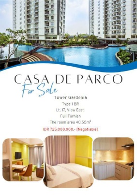 APARTEMEN CASA DE PARCO @BSD CITY Tower Grdenia Type 1 Bedroom Luasan 40,55 sqm Furnish Carport not dedicated Fasilitas : Gym, Kolam renang PPJB Rapi & siap huni Harga 725 jt (nego) More info, Andrew M 0896xxxxxxxx FORTUNELAND *ftlssj Nava Park: Lakewood,Lancewood,Lyndon,Marigold,Laurel,Layton. Tanakayu: Chava,Jiva,Svadhi,Svani,Svasti,Vasya De Park: De Maja,De Naara,De Brassia,De Frangipani,De Heliconia,De Cajuputi. Je Daite Foresta: Allevare,Foglio,Primavera,Ultimo,Albera,Giardina,Fresco,Studento,Naturale,Colinare. Quantis. Myza Avani: Nittaya Aleeka,Ammarila Lavanya,Chadna Anantha,Deshna Divena,********, Zena.Enchante Greenwich: Mayfield,Shefield,Whitsand,Caelus,Luxmore,Hylands,Aether,Imajihaus,Whelford.Fleekhauz Eminent: Ingenia,illustria,Precia,Prestigia,Vivacia,******** Park: Askara,Askara Nue,Azura,Alesha,Anartha,Anila,Assati Tabebuya: Impresahaus,Inspirahuas,********: Kanade,Kazumi,Keia,Kiyora,********: Aerra The Green: Manhattan,Montecarlo Blossomville,Royal Blossom,Banyan Ville,Mirage,Vineyard,********: Welton Icon: Cosmo,Ritzone,Simplicity,Verdant Ville,Verdant View,Eternity,Horizon ********: Freja Chick,Grand Freja Casa De Parco, Sky House, Upper West, Yuthica. Branz. Terravia: Adora. Cascade Tabespots, Northridge Business Center, Foresta Business Loft, North Point, Greenwich Business Park, Delrey Biztown Gading Serpong: Milano,Amalfi,Heron,Leonora,Verona,Matera,Mozart,Agnesi,Boston Village,Riviera,Crown,Crystal, Catalina,Darwin,Dalton,Faraday,M-Town,Nara Village,Omaha,Rainbow Springs,Samara, Scientia,Virginia Village,Madison,Magiore,Menteng Village,Pasadena ********