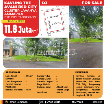TSI/17538 For Sale Kavling The Avani BSD City, Cluster Lavanya Ammarila, Tangerang, 245 m², PPJB Harga Rp 11.8 Juta /m² Alamat BSD City, Tangerang Deskripsi Properti Kavling berada di dalam Cluster Lavanya Ammarila, The Avani BSD City, Tangerang, lokasi premium, lingkungannya nyaman dan aman, bentuk kavling hook, PPJB Luas Tanah 245 m² Dimensi - Luas Bangunan - Jumlah Lantai - Perabotan - Kondisi Hook Kamar Tidur - Kamar Mandi - Garasi / Carport - Jalur Telepon - Daya Listrik - Hadap / View Barat Laut - Barat Daya Sertifikat PPJB LJH Realty Taman Semanan Property Help ✆ 0212903xxxx