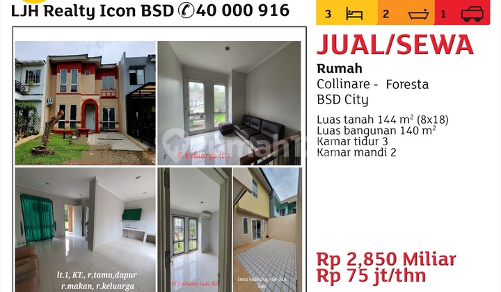 Rumah di BSD Foresta. Temukan rumah 1 lantai yang nyaman ini, disewakan dengan pemandangan asri yang menambah nilai estetika di lingkungan hunian. Rumah ini berada di wilayah yang mudah dijangkau serta menghadirkan lingkungan fasilitas yang lengkap, cocok untuk Anda yang menginginkan hunian nyaman. Spesifikasi Utama Properti: - Kamar Tidur: 3 - Kamar Mandi: 2 - Sertifikat: - - Kondisi Perabotan: Unfurnished Fitur unggulan: - Lokasi di Pusat Kota. - Adem & Sejuk. - Lingkungan Tenang dan Damai. - Properti Bisa Nego. Terletak di BSD Foresta, rumah ini memberikan kemudahan akses ke berbagai fasilitas menarik. Dengan harga Rp. 6.250.000, anda bisa memiliki hunian eksklusif yang sudah siap huni. Segera ambil kesempatan untuk menikmati investasi di kawasan BSD Foresta yang nyaman ini! Hubungi segera untuk informasi lebih lanjut!