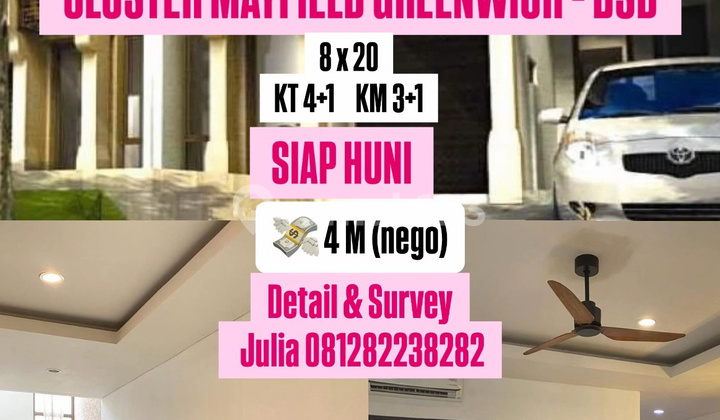 RUMAH DIJUAL CLUSTER MAYFIELD @GREENWICH BSD - Luas Tanah 160 - Dimansi 8x20 - Luas Bangunan 130 - Kamar Tidur 4+1 - Kamar Mandi 3+1 - SHM - Rumah Rapi siap huni - Semi Furnished - 2 Carport & 2 Dapur Harga 4M ( Nego ) JULIA - PROSPERITY 0812xxxxxxxx