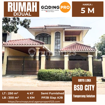 Dijual Cepat !!! Rumah Strategis Modern Griya Loka BSD CITY Tangerang Selatan Spesifikasi : - Luas Tanah : 250m² - Luas Bangunan : 300m² - Kamar Tidur : 3+1 - Kamar Mandi : 4 - Musholla : 1 - Ruang Tamu : 1 - Ruang Makan : 1 - Ruang Keluarga : 1 - Dapur : 1 - Ruang Kerja : 1 - Air PAM BSD - Listrik: 3300 Watt - Carport : 1 - PPJB Siap AJB - Daya Listrik : 3300 W - Hadap Timur - Semi Furnished Fitur unggulan: - Siap Huni. - Bebas Banjir. - Dekat Akses Bus Kota. - Dekat Akses KRL - Dekat Akses Bandara. - Dekat Pusat Perbelanjaan. - Dekat Sekolah Internasional. - Dekat Sekolah Negeri. - Dekat Universitas. - Dekat Fasilitas Kesehatan. - Dekat Tempat Ibadah. Harga Rp. 5M - Nego List By : ~ Idad.one.rafi
