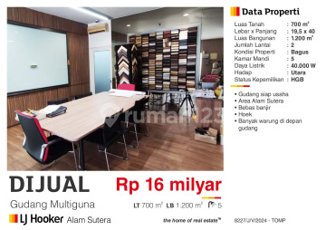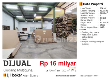 KAPAN LAGI PUNYA Gudang Multiguna Alam Sutera Tengah Kota Tangerang Selatan, Bisa untuk Produksi. LT 17,5x40: 700m2 LB 1200m2 Ruang Kantor Luas dengan Gudang Yang Mumpuni dilengkapi dengan 5 Kamar Mandi dan Listrik Besar 40.000 watt. cocok untuk Industri. Lokasi Strategis dan Bebas Banjir. Hadap UTARA Surat SHGB HARGA Rp. 16 MILYAR Nego *Tom