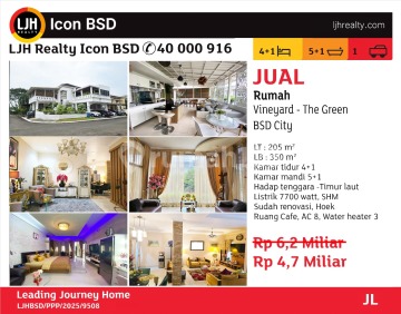 Jual Rumah Hook The Green BSD City LT : 205 LB : 350 KT : 4+1 KM : 5+1 Full Furnish Dekat Ke Stasiun Rawa Buntu Dekat ke Pintu Tol Dekat dengan sekolah sekolah Terbaik di Tangsel. Harga Nego Sampai Deal!!! Hub.i Dian LJH Realty Icon BSD 08529600xxxx