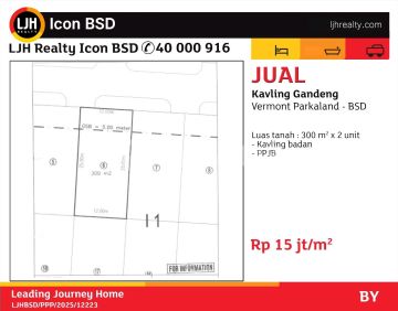*Dijual Kavling Gandeng Vermont Parkland BSD City* Luas tanah : 300 m2 x 2 unit - Kavling badan - PPJB Harga Rp 15 jt/m2 Kode BY-12223
