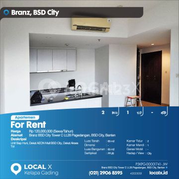 Unit Siap Huni, Dekat AEON Mall BSD City, Dekat Akses Tol For Rent - Sewa Apartemen Branz BSD City Tower C Lt.28 Pagedangan, BSD City, Banten Harga. Rp 12000xxxxSewa/Tahun) Deskripsi Properti. Unit Siap Huni, Dekat AEON Mall BSD City, Dekat Akses Tol Luas Tanah. 65 m2 Dimensi. - Luas Bangunan. 65 m2 Sertipikat. PPJB Kamar Tidur. 2 Kamar Mandi. 1 Garasi Mobil. - Hadap / View. City LOCAL X Kelapa Gading ******** ⓪②① ②⑨⓪⑥ ⑧⑤⑨⑤ P3KPG-0000xxxx-JW-S