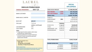 SPESIFIKASI PREMIUM UNIT LAUREL NAVAPARK TIPE CORNER (LN 2/9) Kesempatan istimewa yang sangat langka untuk dapat memiliki satu-satunya unit LAST STOCK yang tersedia di Cluster Laurel, NavaPark BSD City. Unit ini berada di posisi sudut (Hoek) yang strategis, memberikan pencahayaan alami yang maksimal ke dalam seluruh ruangan, sehingga menciptakan suasana tinggal yang lebih terang dan nyaman sepanjang hari. Berikut adalah rincian lengkap spesifikasi dari Unit LN 2/9: Tipe Unit: 12, yang merupakan tipe Corner Unit dengan desain yang mengoptimalkan ruang dan pencahayaan. Luas Tanah yang dimiliki unit ini adalah 345 meter persegi, memberikan ruang luas yang cukup untuk berbagai kebutuhan dan aktivitas keluarga. Luas Bangunan mencapai 445 meter persegi, terbagi ke dalam 3 lantai yang dirancang efisien untuk kenyamanan dan fungsi maksimal. Jumlah kamar tidur yang tersedia adalah 5 kamar utama ditambah 2 kamar tambahan, sehingga total menjadi 7 kamar tidur yang sangat cocok untuk keluarga besar atau kebutuhan ruang multifungsi. Jumlah kamar mandi yang dilengkapi pada unit ini adalah 5 kamar mandi utama plus 1 kamar mandi tambahan, untuk memudahkan akses dan kenyamanan seluruh penghuni rumah. Harga final yang ditawarkan untuk unit ini adalah Rp 20.901.792.xxx,- sudah termasuk Diskon KPR Express, menjadikan harga ini sangat kompetitif untuk sebuah unit dengan kualitas dan lokasi premium. Fitur unggulan yang disematkan di unit ini antara lain: Private Lift merek Mitsubishi dengan kapasitas angkut sebesar 200 kilogram, memberikan kemudahan akses antar lantai dengan privasi tinggi. Lantai unit menggunakan bahan marmer impor pada area ruang tamu (Living), ruang makan (Dining), dan kamar mandi utama (Master Bath) yang tidak hanya indah tetapi juga sangat tahan lama. Sedangkan untuk kamar tidur memakai lantai laminated flooring yang nyaman dan mudah dirawat. Sanitasi menggunakan produk-premium dari merek Kohler dan Toto, memberikan kualitas terbaik dan keindahan pada setiap fasilitas kamar mandi. Dapur dirancang lengkap dengan kabinet dapur basah (Wet Kitchen Cabinet) dilengkapi dengan peralatan memasak merek Franke Appliances yang berkualitas tinggi, memudahkan ak