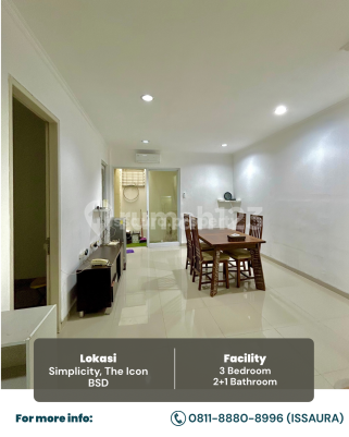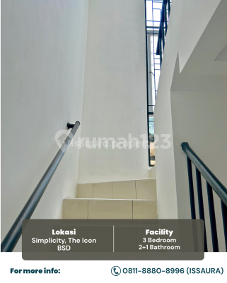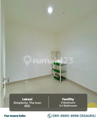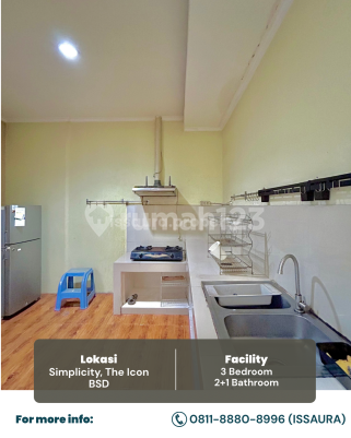 DISEWAKAN RUMAH SIAP HUNI! Cluster Simplicity,The Icon BSD Luas Tanah 112 m² Luas Bangunan 77 m² Kamar Tidur 3 Kamar Mandi 2 2 Lantai Carport 1 Mobil Air PDAM Listrik 3500 watt Internet My Republic Benefit Access : 3 Minutes to BP Gas Station (Coming Soon) 3 Minutes to Toll Gate Serbaraja 5 Minutes to Cisauk Station 5 Minutes to Pasar Intermoda BSD 5 Minutes to Atmajaya Campus 3 BSD 8 Minutes to AEON BSD City 12 Minutes to Eka Hospital Harga 70jt/tahun (Nego) Deposit 7jt Untuk Viewing bisa, Hubungi : Issa 0811xxxxxxxx