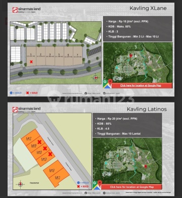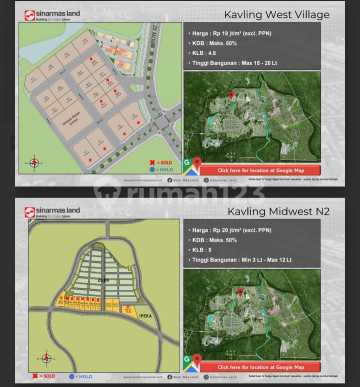 Jual Kavling Komersil di BSD by Sinarmas Land 1. Kav ICE BSD - luas 7303 m² - hadap timur - lokasi dekat Ice Business Park - KDB maks 55% , KLB 5 , Tinggi max 25 lantai - Harga Rp 20 jt / m² ( excl PPN) 2. Kav A16 - luas 2717 m² - hadap barat - lokasi seberang IPEKA - KDB maks 55 %, KLB 4,6 , tinggi max 10 lantai - Harga Rp 18 jt / m² ( excl PPN ) 3. Kav West Village - pilihan luas 1750 m² , 2242 m², 2741 m² sd 2911 m² - Row jalan lebar 20 sd 24 - Satu komplek dengan Genesis Global School - KDB maks 50 %, KLB 4,8 , tinggi max 15 sd 20 lantai - Harga Rp 18 jt /m² ( excl PPN ) 4. Kav Midwest N2 - luas 5568 m² , 6231 m² - dekat dengan IPEKA - hadap selatan - KDB maks 50 % , KLB 5 , tinggi bangunan 3 sd 21 lantai - harga Rp 20 jt / m² ( excl PPN ) 5. Kav Tabebuya - luas 2590 m² - hadap barat - KDB min 20 % - maks 55 %, KLB 5, tinggi bangunan min 3 sd 10 lantai - Harga Rp 20 jt / m² ( excl PPN ) 6. Kav X Lane - luas +/- 1150 m² - hadap selatan - KDB maks 50 % KLB 3 , tinggi bangunan min 3 sd 10 lt - harga Rp 18 jt / m² ( excl PPN ) 7. Kav Latinos - luas 821 m² , 994 m² dan 951 m² - hadap timur laut - KDB 50 %, KLB 4,5 , tinggi bangunan max 10 lantai - Harga Rp 20 jt / m² ( excl PPN )