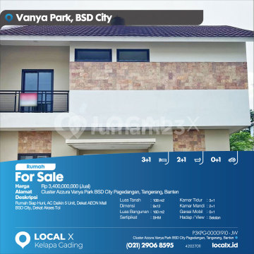 Rumah Siap Huni, AC Daikin 5 Unit, Dekat AEON Mall BSD City, Dekat Akses Tol For Sale - Jual Rumah Cluster Azzura Vanya Park BSD City Pagedangan, Tangerang, Banten Harga. Rp 340000xxxxJual) Deskripsi Properti. Rumah Siap Huni, AC Daikin 5 Unit, Dekat AEON Mall BSD City, Dekat Akses Tol Luas Tanah. 108 m2 Dimensi. 9x12 Luas Bangunan. 160 m2 Sertipikat. SHM Kamar Tidur. 3+1 Kamar Mandi. 2+1 Garasi Mobil. 0+1 Hadap / View. Selatan LOCAL X Kelapa Gading ******** ⓪②① ②⑨⓪⑥ ⑧⑤⑨⑤ P3KPG-0000xxxx-JW-J