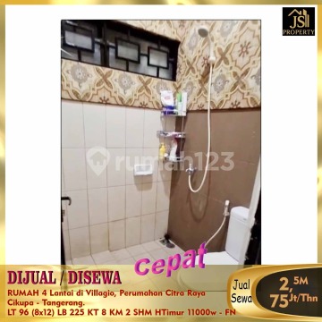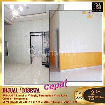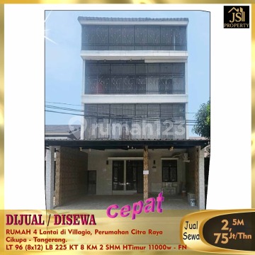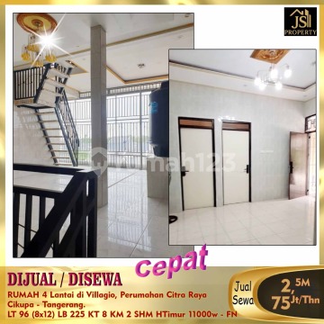 DIJUAL / DISEWAKAN RUMAH 4 Lantai di Villagio, Perumahan Citra Raya Cikupa - Tangerang. Bebas Banjir, Rumah Siap Huni , Design Interior Mewah, Pintu Smart Lock With Finger Print, Card & PIN Carport bisa 3 mobil, ada Toren & mesin pompa. Luas Tanah 96 m² Ukuran Dimensi 8 x 12 m² Luas Bangunan 225 m² 4 Lantai Kamar Tidur 8 Kamar Mandi 2 Gudang 3 Listrik 11.000 Watt Air WTP & Air sumur Hadap Timur SHM Harga Jual 2,5 M Nego Harga Sewa 75Jt/Thn - FN