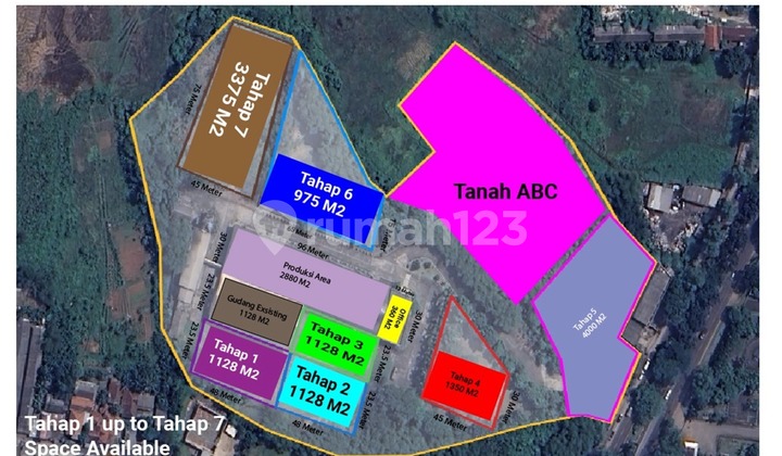 tahap 1 = 1128m2 tahap 2 = 1128m2 tahap 3 = 1128m2 tahap 4 = 1350m2 tahap 5 = 4000m2 tahap 6 = 975m2 tahap 7 = 3375m2 harga jual Rp. 3.5jt/m2 harga sewa Rp. 30rb/m2/bln