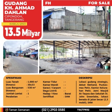 TSI/17932 For Sale Gudang KH. Ahmad Dahlan, Petir, Kec. Cipondoh, Tangerang, 30×33 m², 1 Lt, SHM Harga Rp 13.500.000.xxx Alamat Cipondoh, Tangerang Deskripsi Properti Lokasi gudang strategis, dekat Tol Karang Tengah, Metland Puri, Green Lake City,, Puskesmas Petir, Kantor Kelurahan Petir, Jami Masjid At-Taqwa dan Sekolah St. John Greenlake, lokasi berada di jalan besar (muat 2,5 mobil atau truk kecil), SHM Luas Tanah 1,000 m² Dimensi 30×33 Luas Bangunan 530 m² Dimensi - Jumlah Lantai 1 Perabotan - Kamar Tidur - Kamar Mandi - Garasi / Carport - Jalur Telepon - Daya Listrik - Hadap / View Barat Sertifikat SHM LJH Realty Taman Semanan