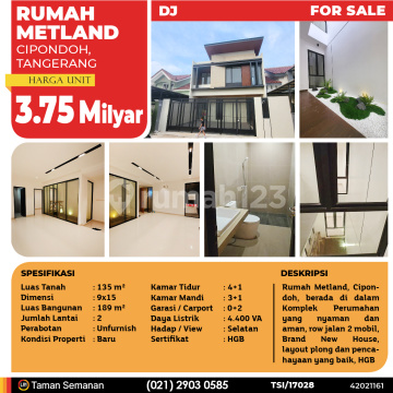TSI/17028 For Sale Rumah Metland, Cipondoh, 9x15 m², 2 Lt, HGB Harga Rp 3.750.000.xxx Alamat Cipondoh, Tangerang Deskripsi Properti Rumah Metland, Cipondoh, berada di dalam Komplek Perumahan yang nyaman dan aman, row jalan 2 mobil, Brand New House, layout plong dan pencahayaan yang baik, HGB Luas Tanah 135 m² Dimensi 9x15 Luas Bangunan 189 m² Jumlah Lantai 2 Perabotan Unfurnish Kondisi Baru Kamar Tidur 4+1 Kamar Mandi 3+1 Garasi / Carport 0+2 Jalur Telepon - Daya Listrik 4.400 VA Hadap / View Selatan Sertifikat HGB LJH Realty Taman Semanan Property Help ✆ 0212903xxxx