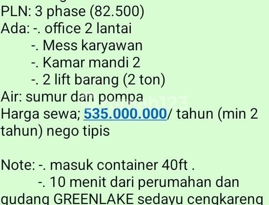 Sewa gudang!!!! Alamat: *KAVLING DPR* Luas tanah: 800 (20x40) Luas bangunan: 1400 PLN: 3 phase (82.500) Ada: -. office 2 lantai -. Mess karyawan -. Kamar mandi 2 -. 2 lift barang (2 ton) Air: sumur dan pompa Harga sewa; 535.000.xxx/ tahun (min 2 tahun) nego tipis Note: -. masuk container 40ft . -. 10 menit dari perumahan dan gudang GREENLAKE sedayu cengkareng -. PPH (kalau ada), dibayar oleh penyewa dan biaya notaris bagi 2 (penyewa dan pemilik) unit ready dan bisa disurvei jamur