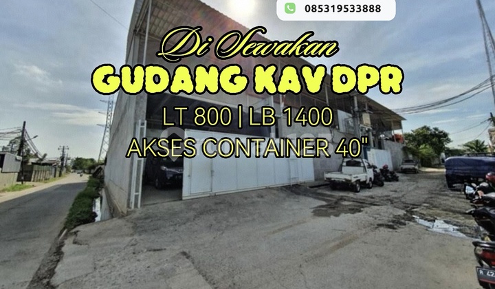 Disewakan Gudang kav dpr Lt 800 Lb 1400 Air tanah Listrik 3 phase (82.500W) Akses kontainer 40 fit Harga 1.1 M minimal sewa 2 thn