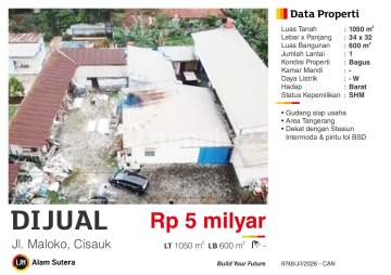 Gudang di Cisauk, Tangerang. For sale di wilayah yang tenang. Dengan spesifikasinya adalah sebagai berikut: - Kamar Mandi: 2 - Sertifikat: SHM - Sertifikat Hak Milik - Kondisi Perabotan: Unfurnished Telah lengkap dengan fasilitas: - Jalur Telepon. Dan properti ini juga pilihan tepat karena: - Bisa KPR. - Siap Huni. - Bebas Banjir. - Dekat Akses KRL. - Dekat Akses Tol. - Lokasi dipusat kota. - City View. - Cocok Untuk Investasi. - Lokasi Strategis. - Properti Bisa Nego. Lokasi gudang ini mudah dijangkau, hanya selangkah menuju berbagai fasilitas utama dan menarik. Dengan Rp. 5.000.000.xxx, anda dapat langsung dapatkan gudang premium di daerah Cisauk ini.