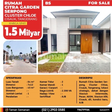 TSI/17724 For Sale Rumah Citra Garden Serpong, Cluster Chloe, Tangerang, 7x12 m², 1 Lt, AJB Harga Rp 1.5 Milyar Alamat Cisauk, Tangerang Deskripsi Properti Rumah Citra Garden Serpong, Cluster Chloe, Tangerang, lokasi strategis, dekat dengan Stasiun Intermoda, Pasar, AEON, Stasiun KRL Cisauk, dll, kondisi baru, AJB Luas Tanah 84 m² Dimensi 7x12 Luas Bangunan 45 m² Dimensi - Jumlah Lantai 1 Perabotan - Kamar Tidur 2 Kamar Mandi 1 Garasi / Carport - Jalur Telepon - Daya Listrik 2.200 VA Hadap / View - Sertifikat AJB LJH Realty Taman Semanan Property Help ✆ 0212903xxxx
