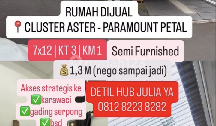 RUMAH MINIMALIS MODERN CLUSTER ASTER PARAMOUNT PETAL DIMENSI 7x12 LB: 50M KT 3 KM 1 3600W 1 lantai PPJB SIAP AJB SEMI FURNISHED Sudah Dapet kanopi dpn blkg, pintu kawat, gorden, lemari 4 pintu, sofa L AC 2 UNIT bebas banjir Lokasi Strategis * 500m RS keluarga kita / bethsaida clinic * 500m resto kampung kecil * 2km to sekolah strada curug * 7km to mall ciputra citra raya * 8km to mall karawaci, siloam hospital, SPH/UPH 1,.3 M (nego sampe jadi) JULIA - PROSPERITY ☎️ 0812xxxxxxxx shrlpp #propertisamajuliaaja #rumahmurah #rumahminimalismodern