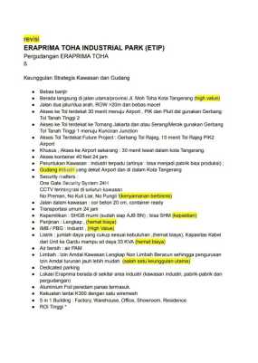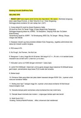 Gudang Murah EraPrima Toha tangerang Dekat bandara Soekarno hatta Jl. M. Toha KM 5 no. 1 Kota Tangerang 15131 Luas Tanah 261 M2 Luas Bangunan 270 M2 Harga 3.950.000.xxx ERAPRIMA TOHA INDUSTRIAL PARK PERGUDANGAN SIAP PAKAI DENGAN IZIN INDUSTRI DI TANGERANG * AKSES TOL BARU LANGSUNG PIK-TANGERANG * KEAMANAN 24 JAM * BEBAS PUNGLI & BEBAS KULI BONGKAR MUAT * SETELAH DP SERAH TERIMA GUDANG * DEKAT DENGAN BANDARA SOEKARNO HATTA * BEBAS BANJIR * INFRASTRUKTUR PRIMA Info Lebih lanjut Hub : Shafa 08131667xxxx