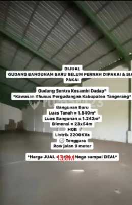 Dijual Gudang Sentra Kosambi Dadap, Kawasan Khusus Pergudangan Kabupaten Tangerang Bangunan Baru LT 1.540m2 LB 1.242m2 (23×54m) Listrik 2200Kva HGB Hadap Tenggara Row jalan 9 meter *Harga 13.8 m nego* Melly
