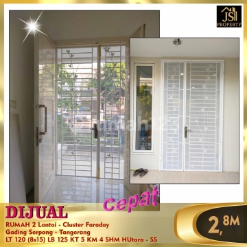 DIJUAL CEPAT RUMAH 2 Lantai - Cluster Faraday Gading Serpong - Tangerang Dekat Kulineran Luas tanah 120 m² Dimensi 8x15 m² Luas Bangunan 125 m² 2 Lantai Kamar Tidur 4+1 Kamar Mandi 3+1 Listrik 2.300Watt Air PAM Carpot 1 Garasi 1 Sertifikat SHM (on hand) Hadap Utara Harga 2,8 M Nego - SS
