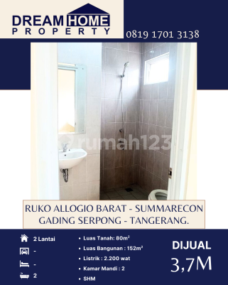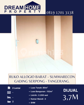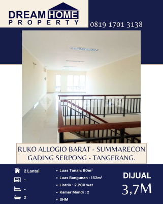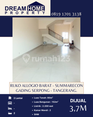 DIJUAL Ruko Allogio Barat - Summarecon Gading Serpong - Tangerang. Luas Tanah : 80m2 Luas Bangunan : 152m2 2 Lantai KM : 2 Listrik : 2.200 Watt SHM Harga : 3,7M Dream Home Property