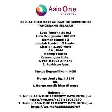 DI JUAL RUKO DAERAH GADING SERPONG DI TANGERANG SELATAN Luas Tanah : 54 m2 Luas Bangunan : 100 m2 Kamar Mandi : 2 Jumlah Lantai : 2 Lantai Listrik : 3.300 Watt Air : PAM Hadap : Barat Keterangan Lain : 1. Posisi ruko di hoek 2. Parkiran luas Status Kepemilikan : HGB Harga Jual : Rp, 1,95 M NB. 1. Harga masih bisa di nego Hubungi : 1. Tanu ( ASIA ONE PROPERTY KAYU PUTIH ) –> ******** Stella ( ASIA ONE PROPERTY KAYU PUTIH ) –> ******** #property