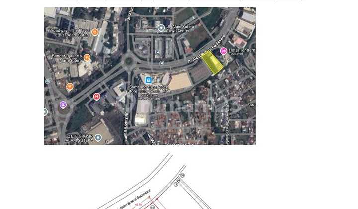Di Jual : Kav Tanah seluas 5.001 mtr ( Lebar Depan 42,8 M - Lebar Belakang 53,9 M x Panjang 105 M & 99 M : bentuk ngantong ). Sertifikat HGB - di Jln Boulevard Alam Sutera - Serpong dgn Harga Rp 175 M. Lokasi bersebelahan dgn Hotel Tentrem & berdekatan dgn Mall Living World